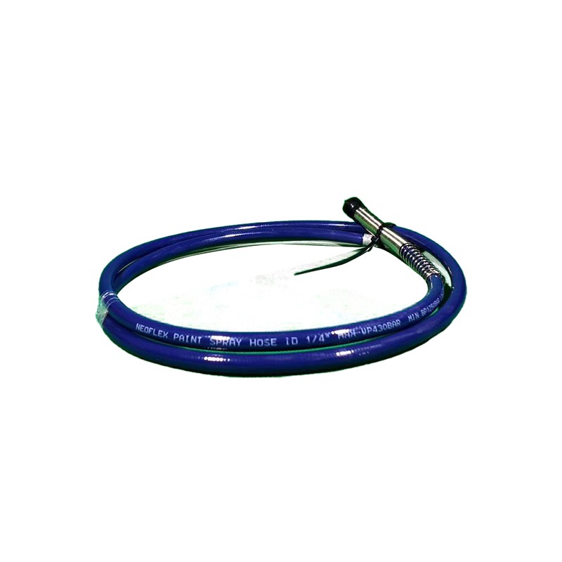 This 1/4" whip hose from Neoflex (Korea) is a flexible, high-pressure extension hose designed for use between the spray gun and main paint hose. With a working pressure of 430 Bar (6,235 PSI) and a 1.80-meter length, it helps reduce operator fatigue and provides better control during airless spray painting applications.